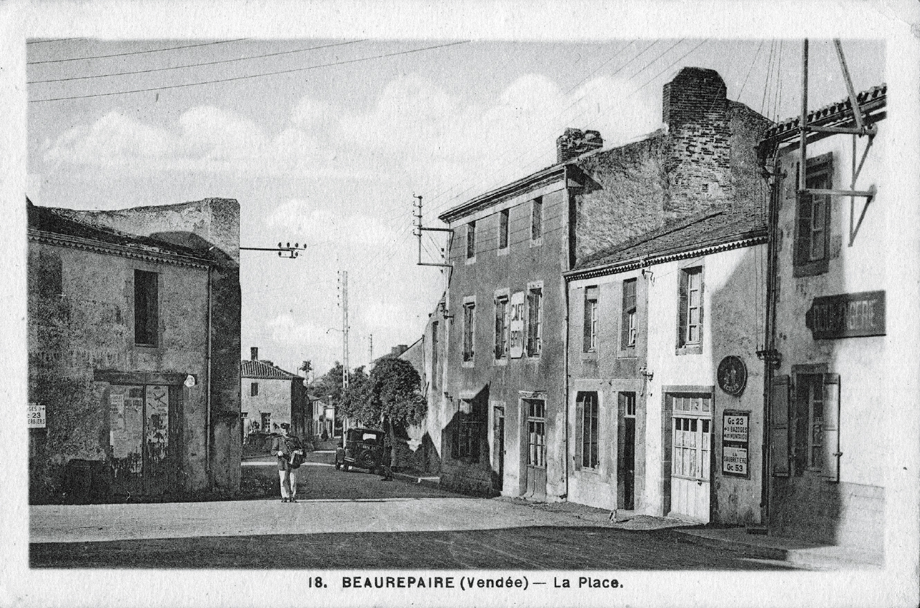 La place, de Beaurepaire, vers 1930. À droite, la façade du café Auguste Brin de 1914 à 1963, où se sont déroulées les répétitions du groupe Tréteaux et Terroirs, de Saint-Fulgent. Carte postale Jehly-Poupin ; coll. : P. Brachet ; fonds : OPCI-EthnoDoc-Arexcpo.