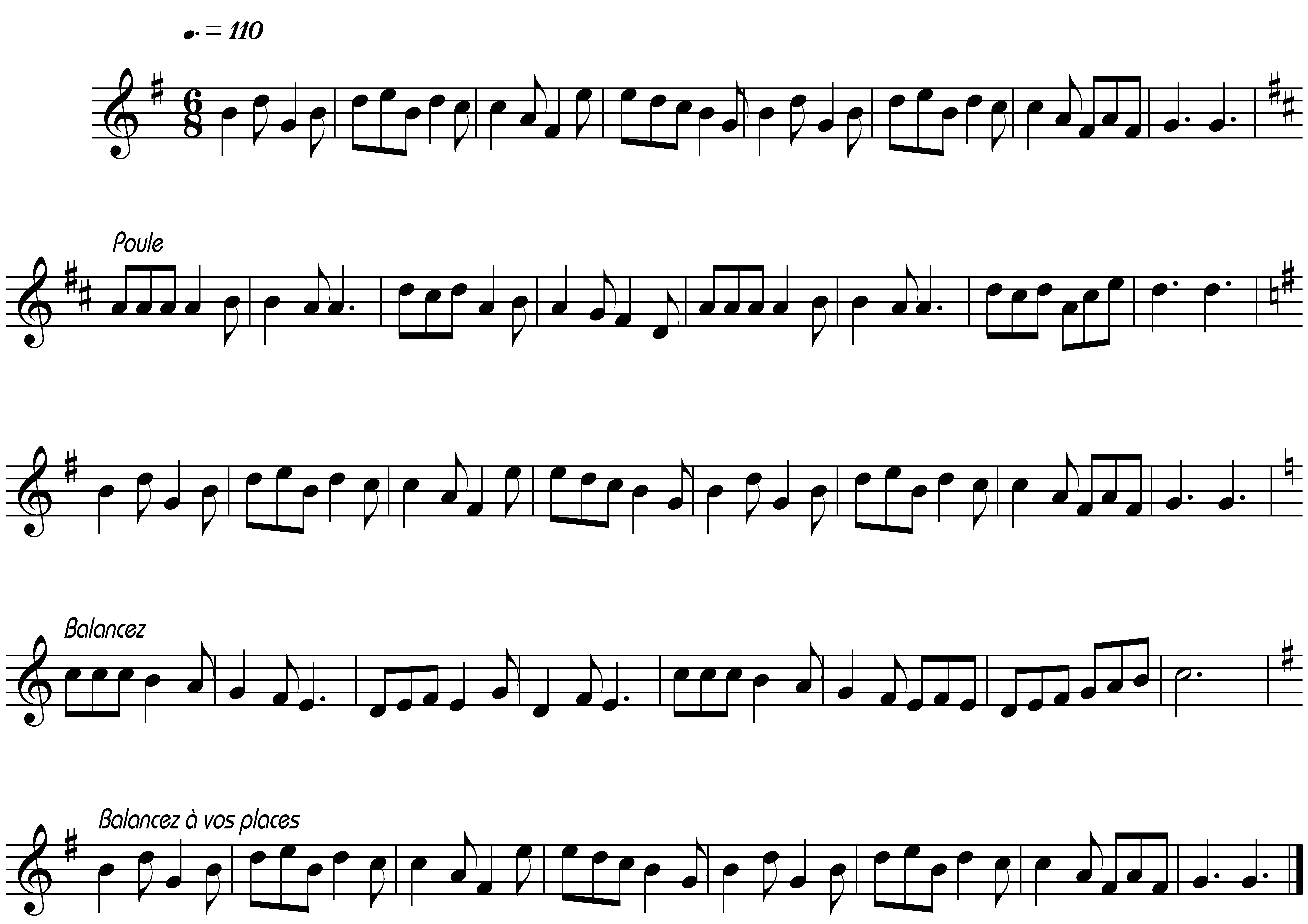 À noter une particularité : Brin enchaîne six figures, alors qu’un quadrille en comporte habituellement cinq. Peut-être une erreur liée au fait qu’il fait suivre la première figure, La chaîne anglaise, d’un En avant-deux ? Nous avons choisi de restituer la version telle qu’il l’a transmise.