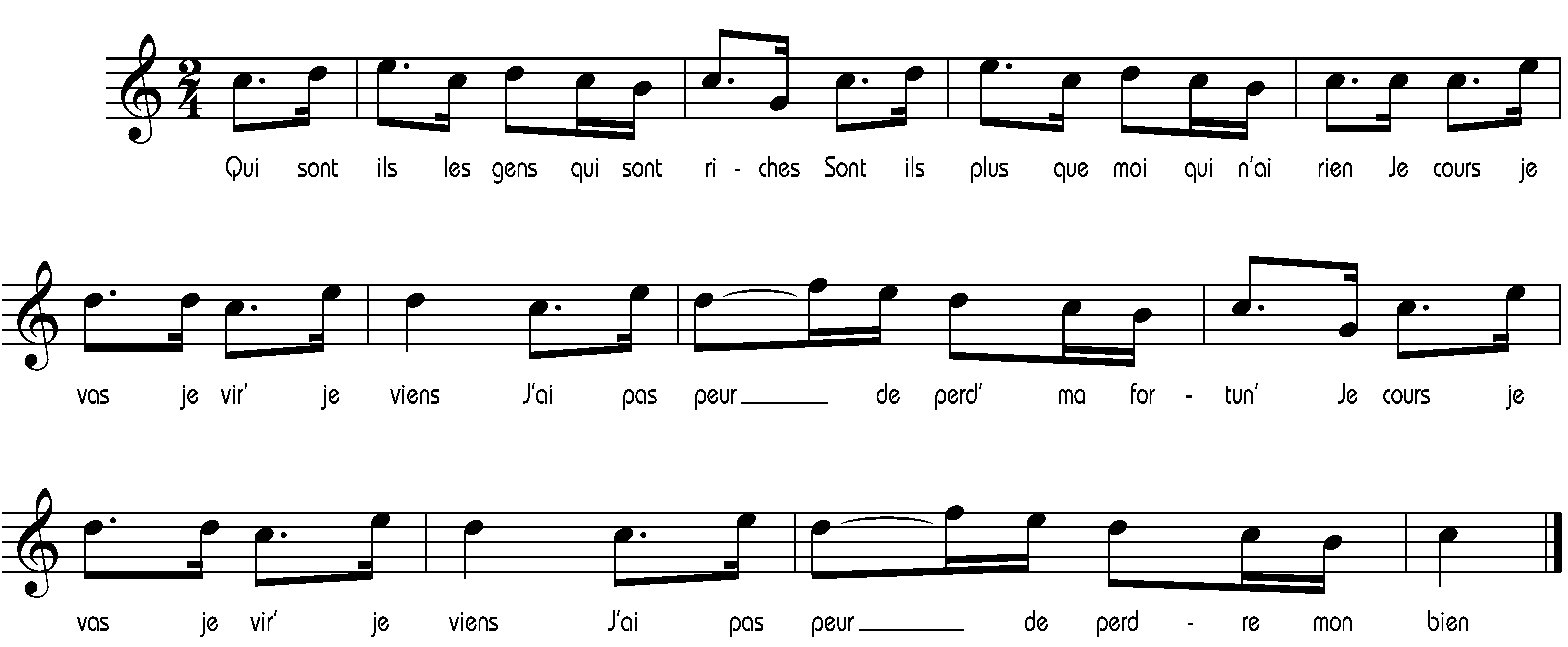 Quant au chant, il est à rattacher aux branles anciens et il existe de nombreuses versions musicales et rythmiques dont pour un mener le branle, à L’Épine, la maraîchine, l’avant-deux… et la valse en Mayenne… (François Redhon) ! Louis Guilloux, dans La maison du peuple (Grasset, 1927), cite également des versions issues du Morvan ou des Côtes-d’Armor. Peut-être faut-il y voir une morale populaire, destinée à séduire les « petites gens ».